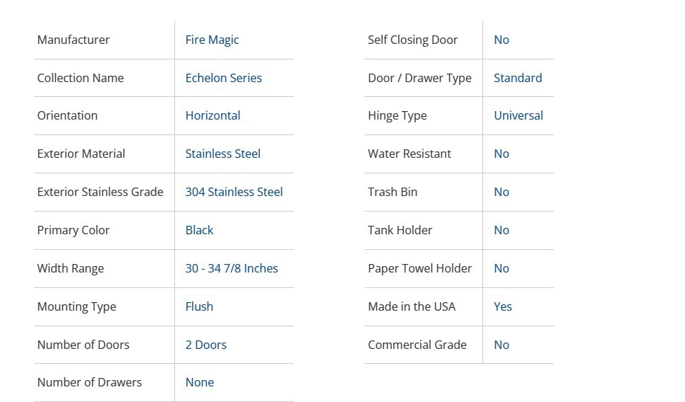- Thick, ergonomic handles allow you to open and close the Fire Magic Echelon Flush 30 X 14-Inch Black Double Access Door without causing any loud bangs.