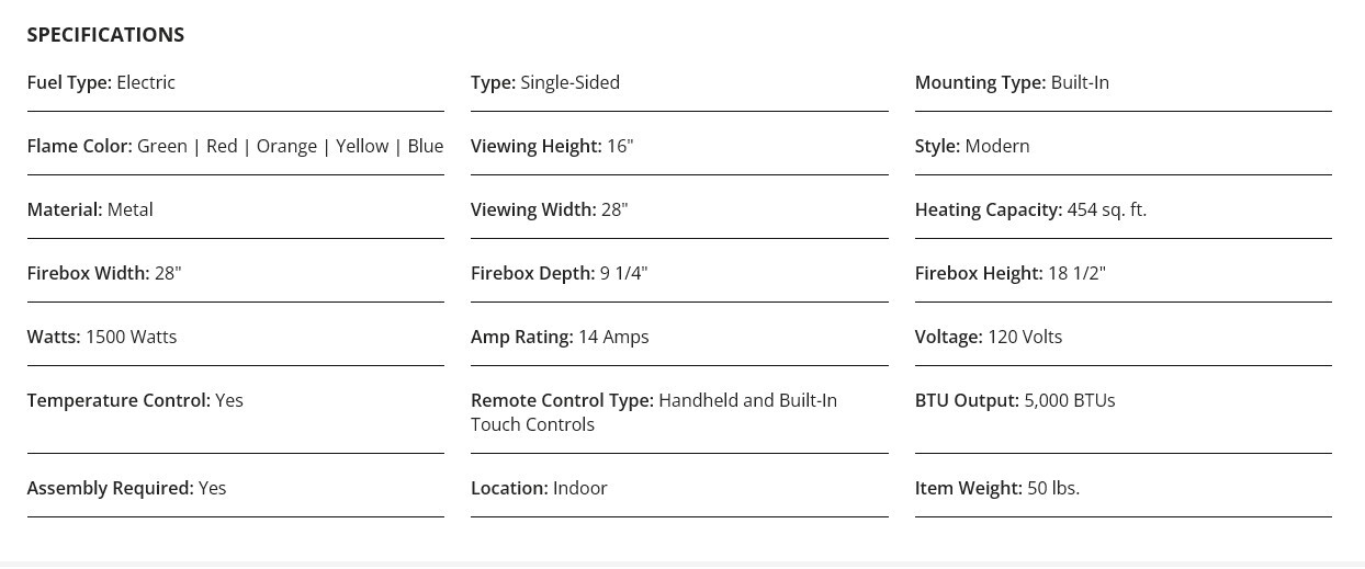 The Modern Flames Redstone Single-Sided Electric Fireplace – 30” plugs into a standard, 120-volt outlet and quickly warms your space with its energy-efficient heater. You can easily slide it into an existing zero-clearance wood burning fireplace or recess it into a wall with a 10-inch depth for a clean, flush-mount finish. Variable and thermostatically controlled heat, a shutoff timer, built-in controls, and a hand-held remote provide maximum comfort and convenient operation.