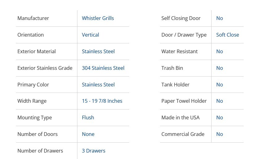 - The Whistler Triple Drawer CBATD maximizes storage potential with three full-extension drawers built from durable 304 stainless steel. This storage solution features high-quality drawer slides and thoughtful construction that stands up to outdoor use while maintaining organization.