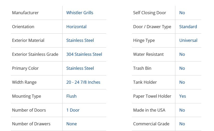 - The Whistler Single Door CBASDH2014 offers horizontal storage access with a clean, professional look thanks to its brushed stainless finish and hidden hinge design. This 20×14 inch door combines quality materials with practical functionality for your outdoor cooking space.