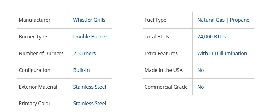 - Complete your outdoor grill island with the Whistler Built-In Gas Double Side Burner with Lid. This double burner will work separately from the main grill to provide additional cooking space without taking up the main area. It is fashioned from top quality, food grade 304 stainless steel that is resistant to rust and corrosion. The burner comes with a stainless steel grate as well as two cast brass burners that generate a total of 24,000 BTUs. There is a grease management system that includes a removable grease tray to make it easier to clean. Thanks to the blue LED backlit control panels, you can easily cook after dark.